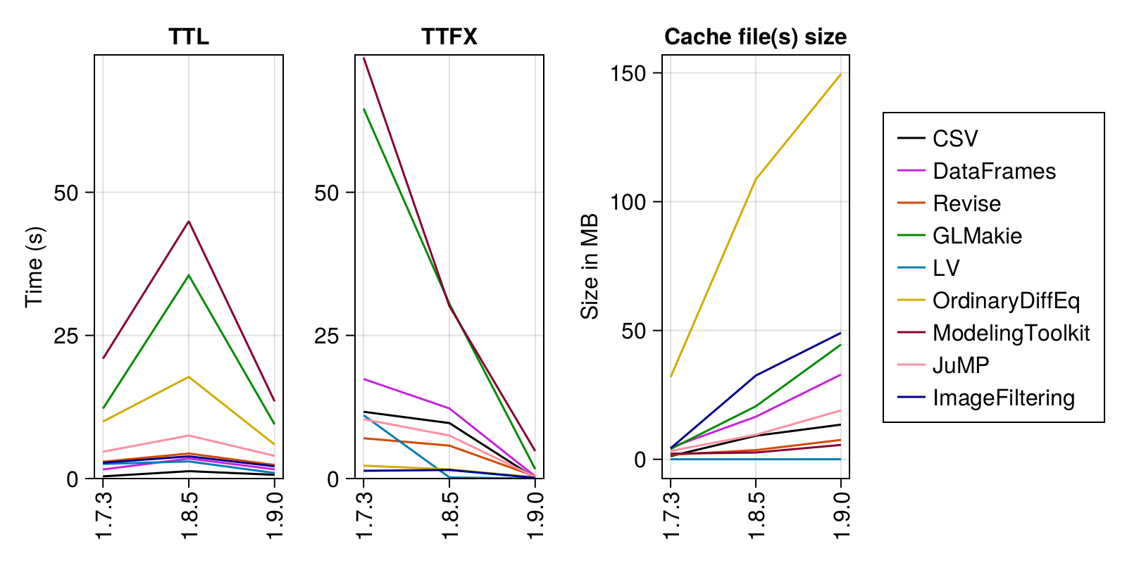 The graph below illustrates the changes in time-to-load (TTL), TTFX, and cache file size starting with Julia 1.7 (prior to any of the recent precompilation improvements):