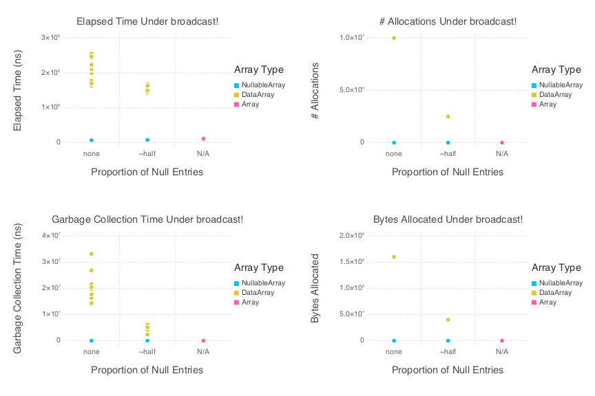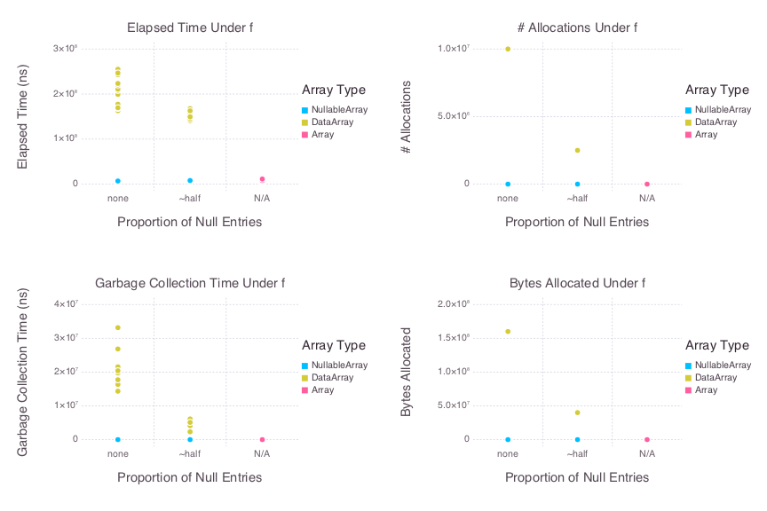 As can be seen, naively looping over a NullableArray is on the same order of magnitude as naively looping over a regular Array in terms of both time elapsed and memory allocated. Below is a set of plots (drawn with Gadfly.jl) that visualize the results of running 20 benchmark samples of f over both NullableArray and DataArray arguments each consisting of 5,000,000 random Float64 values and containing either zero null entries or approximately half randomly chosen null entries.